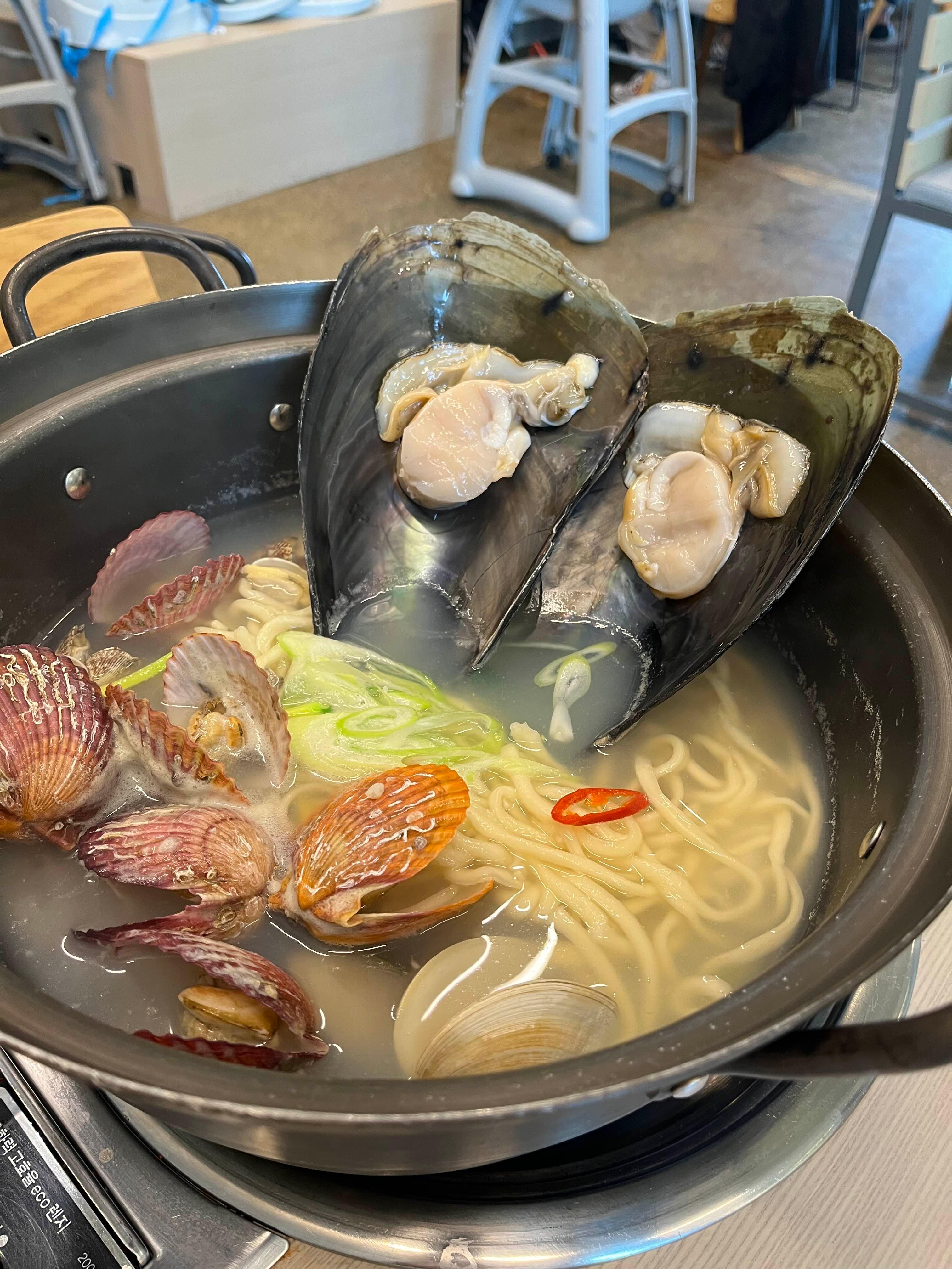 키조개는 잘 익었고 크기가 큰데 관자부분은 엄청 부드러웠지만 관자 이외에 부분은 미끄덩하면서 잘 씹히진 않았어요 키조개와 가리비도 충분했지만 바지락 양이 진짜 어마어마해서 나중엔 퍼먹을 정도였어요